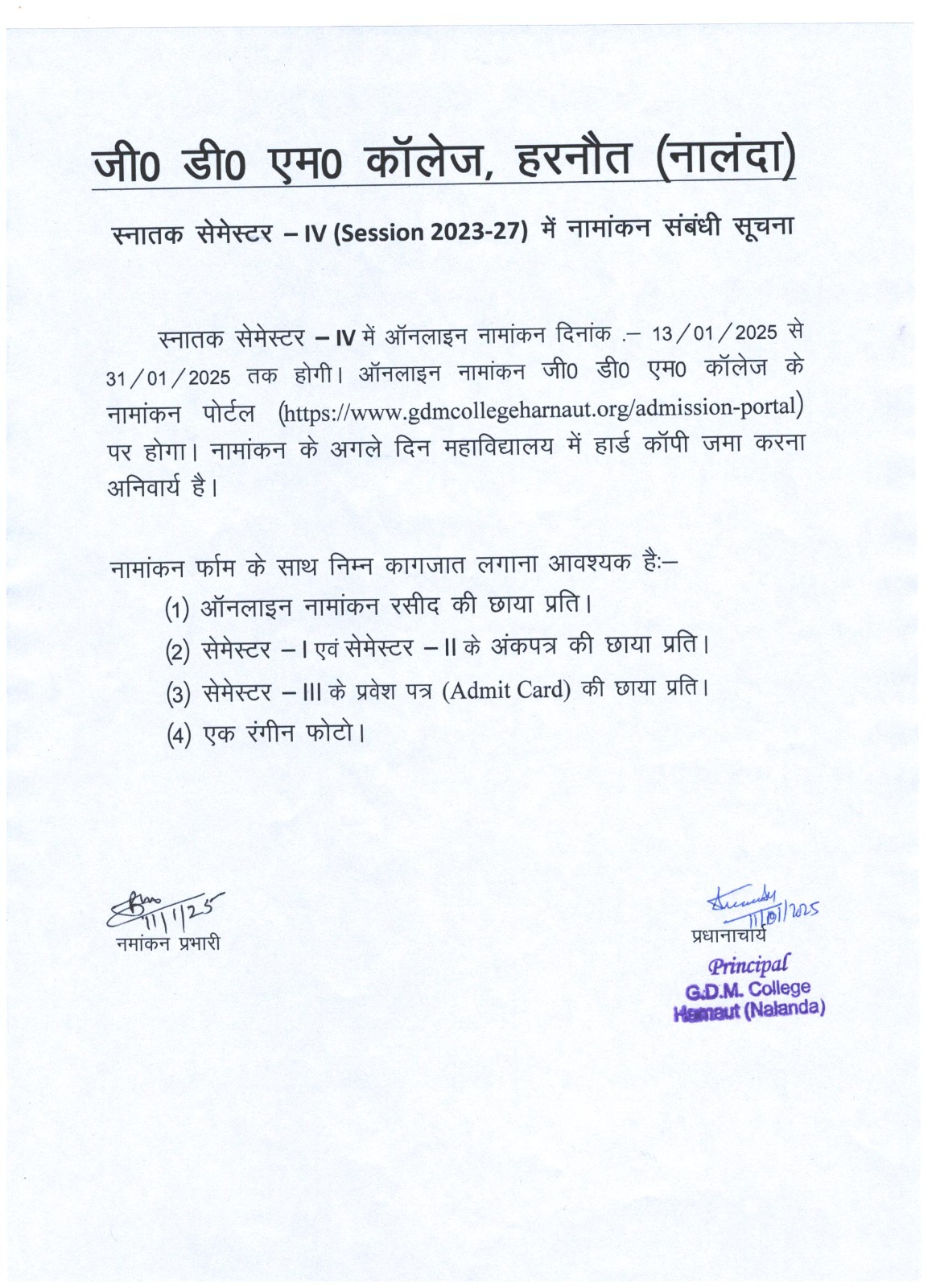 सभी छात्र एवं छात्राओं को सूचित किया जाता है कि On-line Admission Form Fill एवं Payment करने के बाद College में आकर मूल दस्तावेजों का सत्यापन (Documents Verification) जाकर सुनिश्चित करें ।